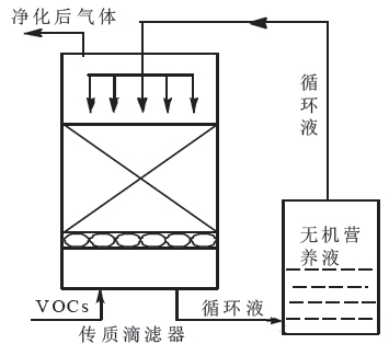 生物洗涤器(下图)反应条件温和、操作稳定;但其运行成本高,处理的VOCs 需要易溶于水。